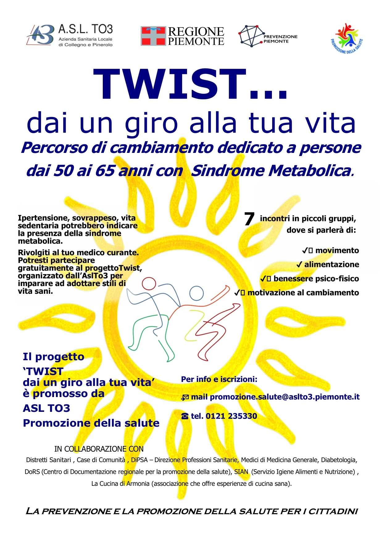 Il progetto rappresenta un'importante occasione per i cittadini di intraprendere un percorso di miglioramento del proprio benessere, supportati da professionisti qualificati e in un contesto di gruppo che favorisce la condivisione e la motivazione reciproca. Si svolgeranno sette incontri settimanali organizzati in piccoli gruppi. Gli incontri saranno dedicati a quattro aree fondamentali: